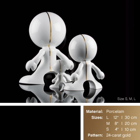 Each +EYE White Knight ”Gold” is an unique handmade porcelain designer art toy in 3 different sizes, all in an exclusive gloss white lacquered chest. Each art toy individually hand painted with a 24-carat gold rim.